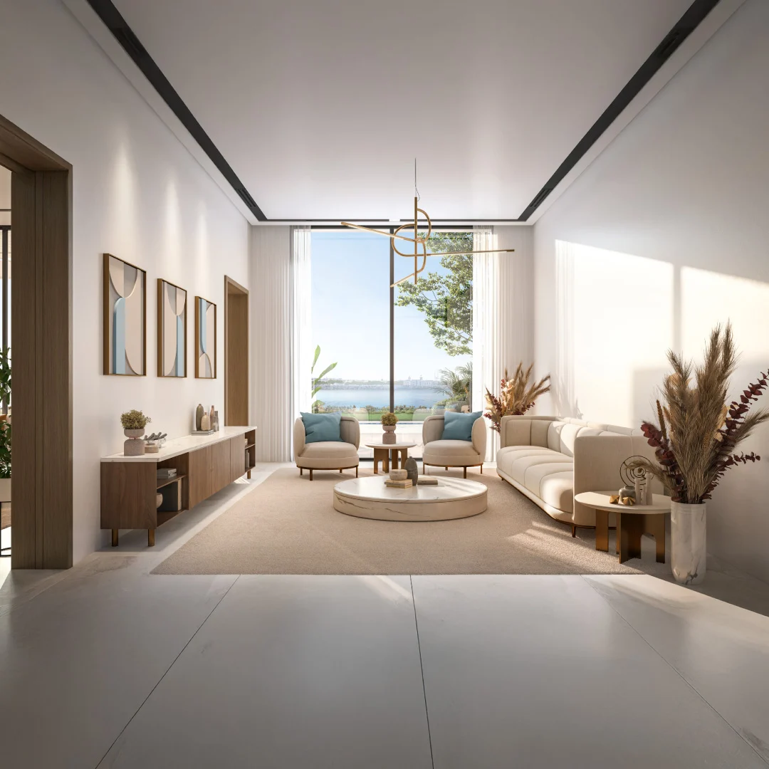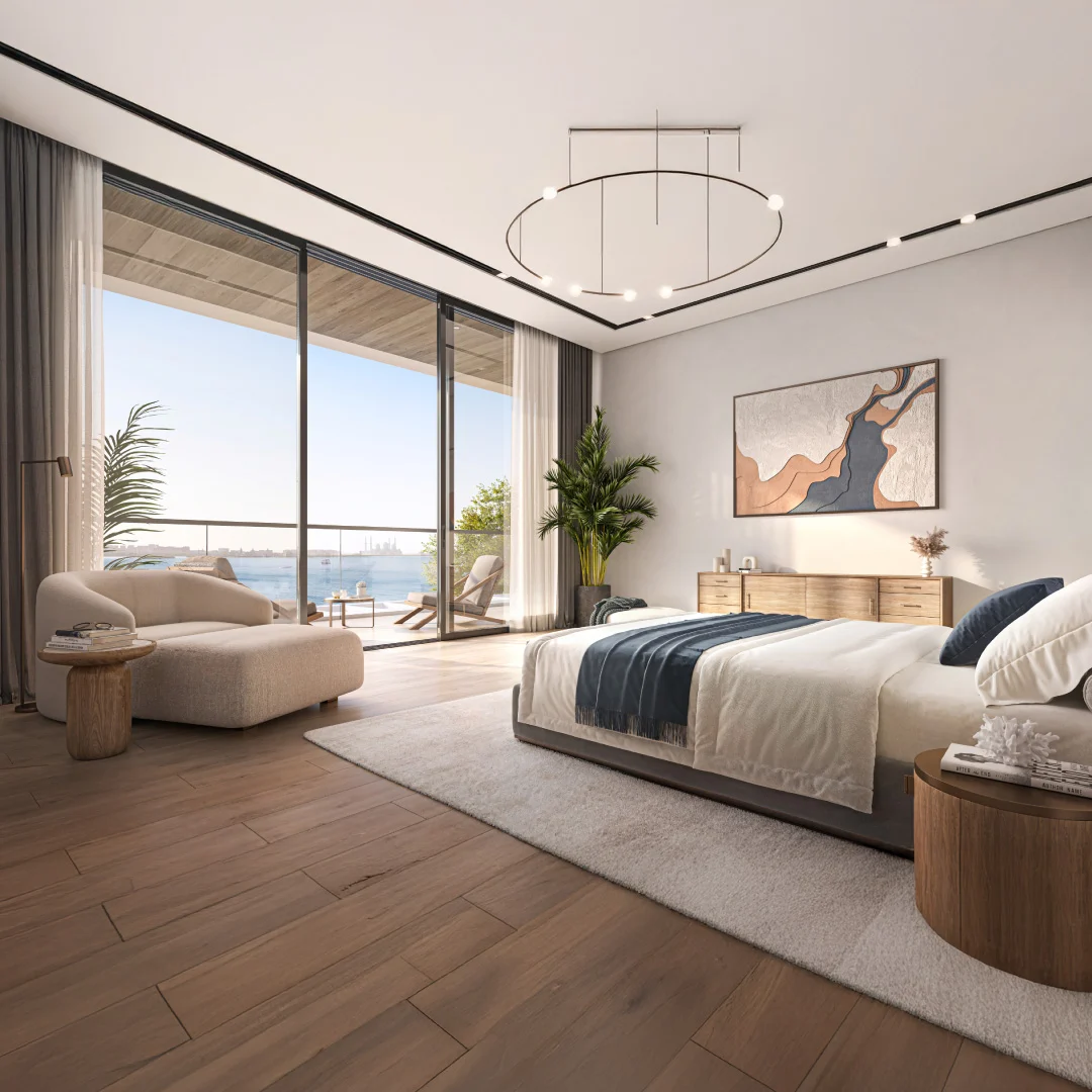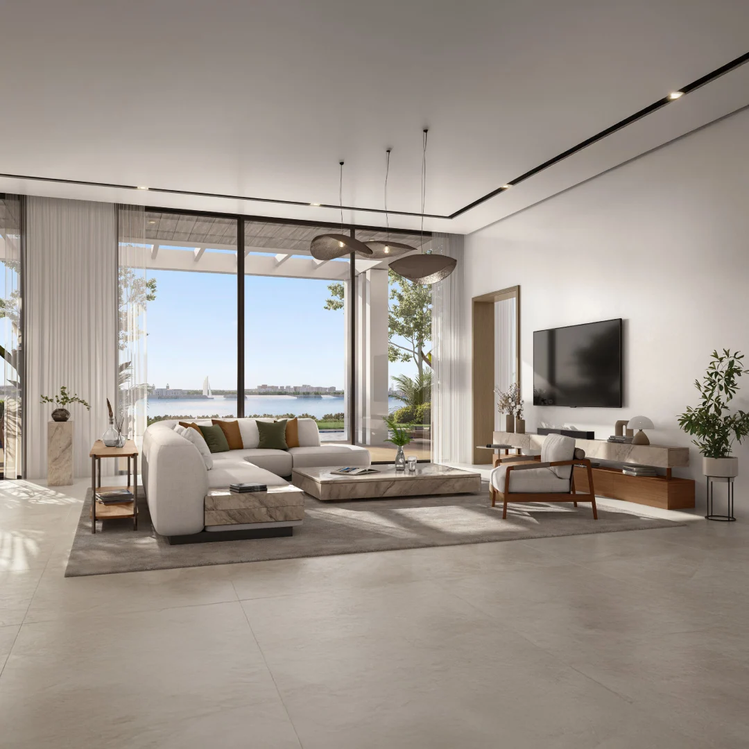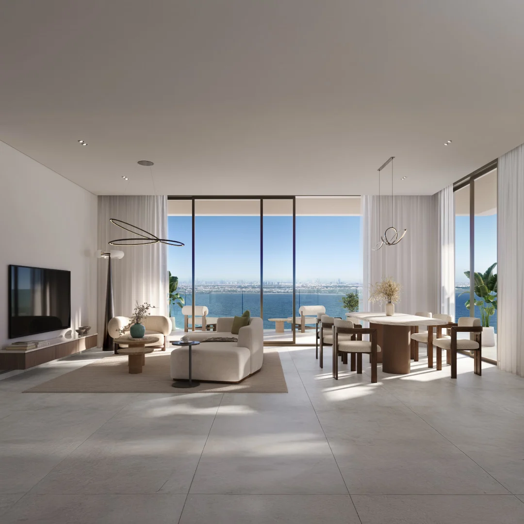 Homes are positioned above the waterfront promenade and offer panoramic views of the sea, skyline, and greenery. Interiors include spacious living areas, open dining, modern kitchens, and master bedrooms with high ceilings, large windows, and private balconies.