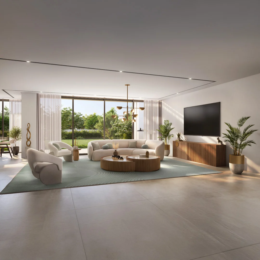 The mid-rise buildings feature stylish contemporary architecture, with cascading terraces, sand-toned facades, and large windows that connect elegant indoor living with open outdoor views.